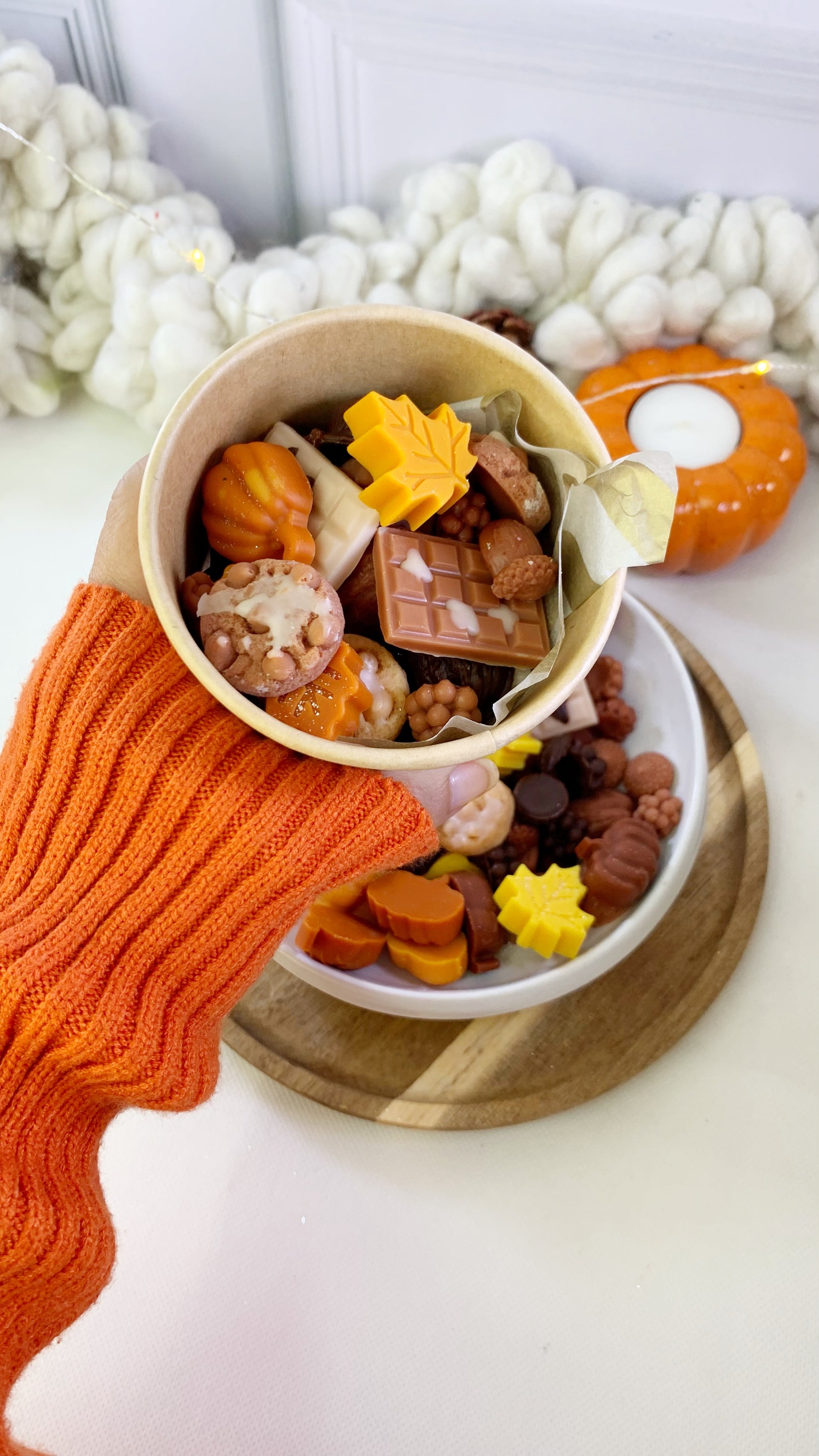 Una celebración aromática que abraza el alma. Notas dulces de vainilla, calabaza y almendras se entrelazan con la calidez de la canela, la nuez moscada y el toque cítrico de la naranja. Diseñadas como pequeñas joyas en forma de galletas, chocolates y calabazas, estas ceras de wax melts, invitan a encender el otoño en casa y dejar que cada rincón huela a abrazo y cosecha.