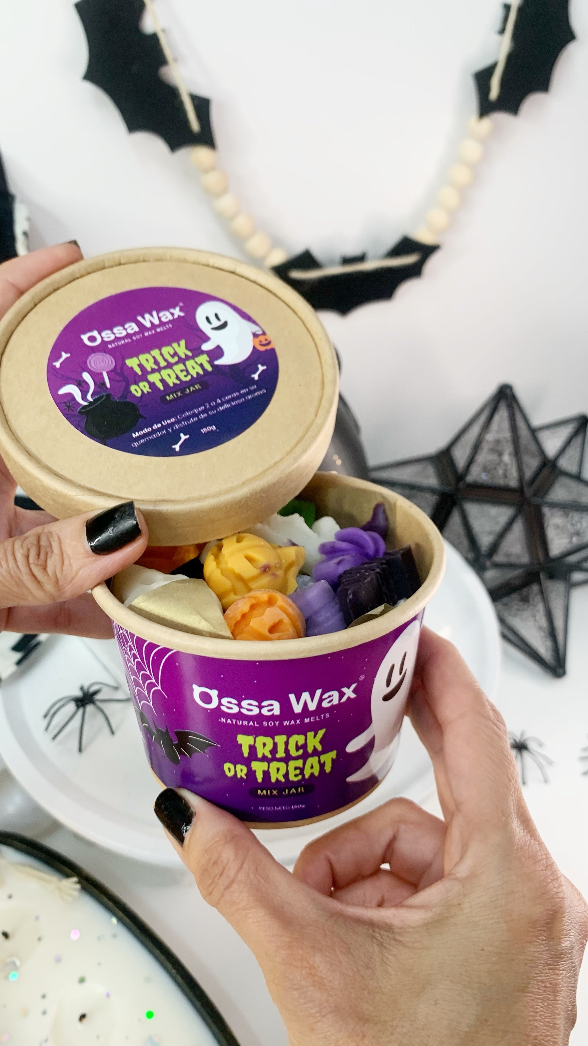 Ossa Wax Mix Jar Trick or Treat, con cera de soya 100 % natural y biodegradable, nuestras ceras con diseños escalofriantes y divertidos infundidas en aceites esenciales otoñales, serán la delicia en tu hogar.